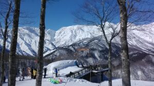 部屋の窓から白馬山麓に広がるスキー場のゲレンデが見え、右(北)から左(南)へ岩岳、八方尾根、白馬47、五竜が連なってます。