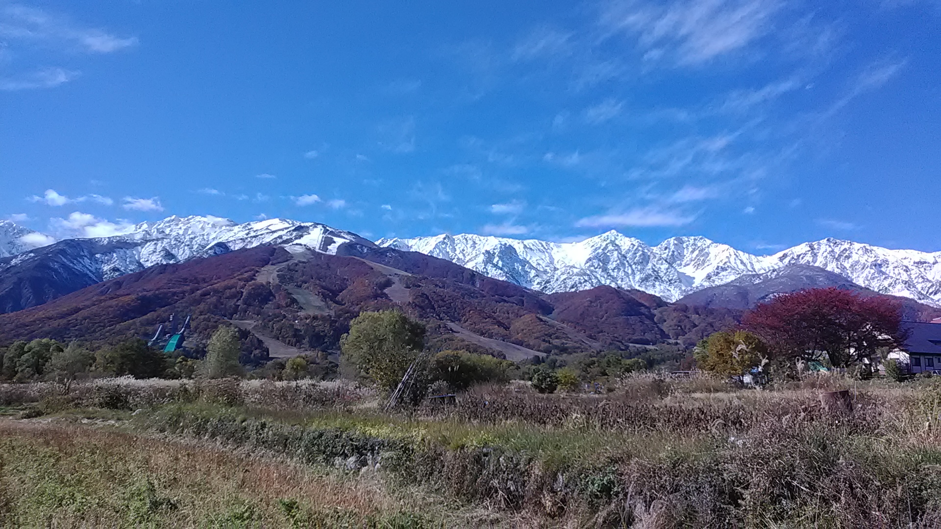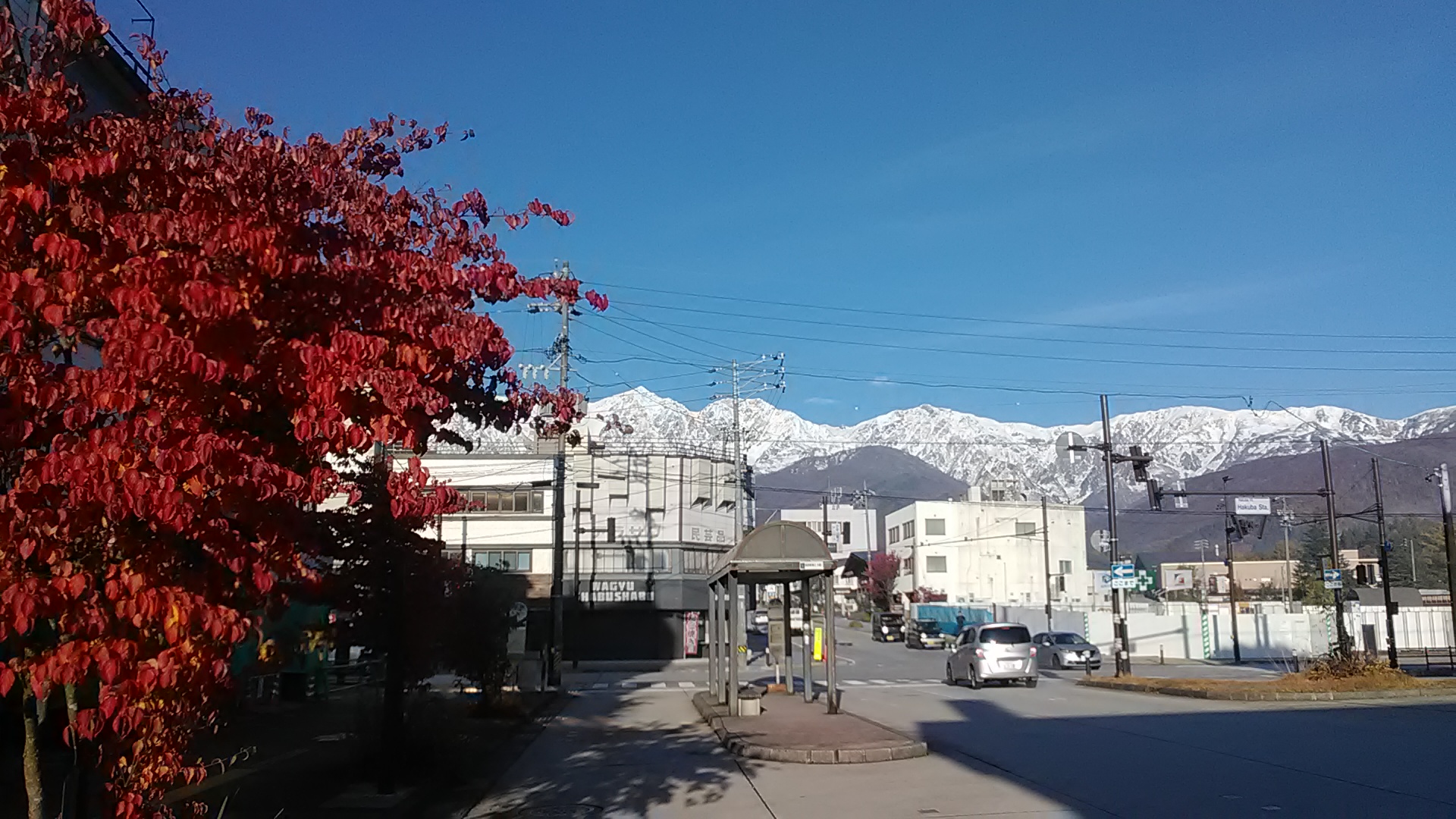 駅前まで来て何気なく振り返ったら霧はいつの間にか消え去り見事な白き白馬三山が姿を見せてくれてました。駅のロータリーに植えられたヤマボウシも鮮やかに紅葉していて、バス待ちの観光客は一人残らず全員がスマホを向けてました。そりゃそうでしょうね。ここに住んでても撮りたくなるもん。何度見ても飽きないし。