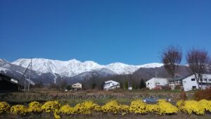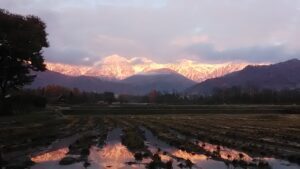 夜明けのモルゲンロートに色付く白馬三山と、アパートの駐車場横から見た初冬の白馬連峰(写真 5・6)。