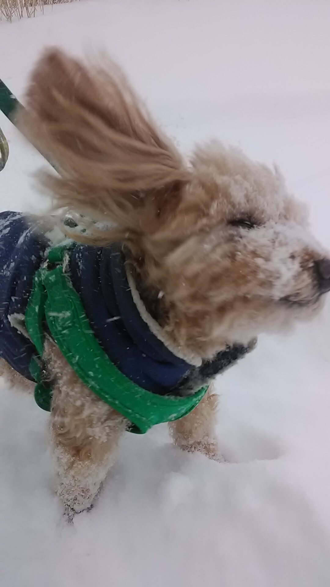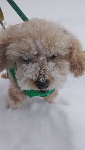 雪の日、ハチはしばらく降るにまかせて歩いてますが、ガマンが限界にくるとブルブルブルで顔に積もった雪をふるい落とし、その瞬間は何とも微笑ましい(写真 2・3)。