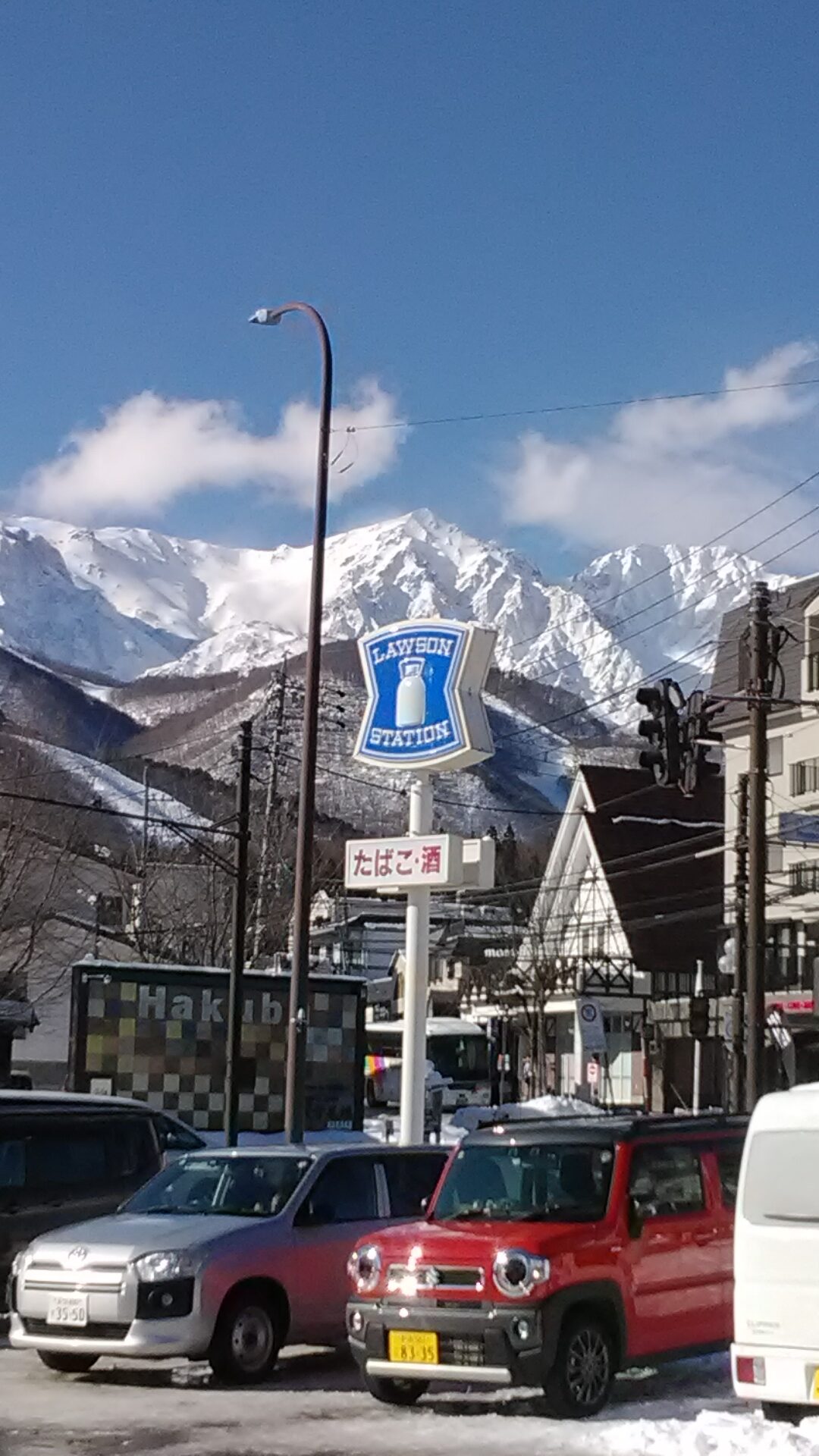 スキー場の入り口交差点にローソンがあります。観光客に大迷惑してる富士山ローソンみたいな写真を撮ろうと思ったんですが無理でした。店の屋根とアルプスの方角が合わず、建物の周囲を一周しても店の屋根にアルプスが乗るポイントがありません。そもそも山が近すぎて店からはみ出してしまうし。