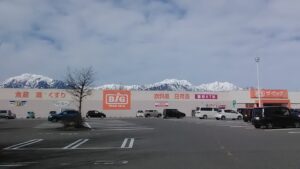 白馬村のお隣り、大町市で撮ったそれらしき写真がありました。12月23日、まったく雪がない市街地ですがビック(イオン系列)へ買い物に行ったら屋根にアルプスが乗っかってました。曇ってましたけど。