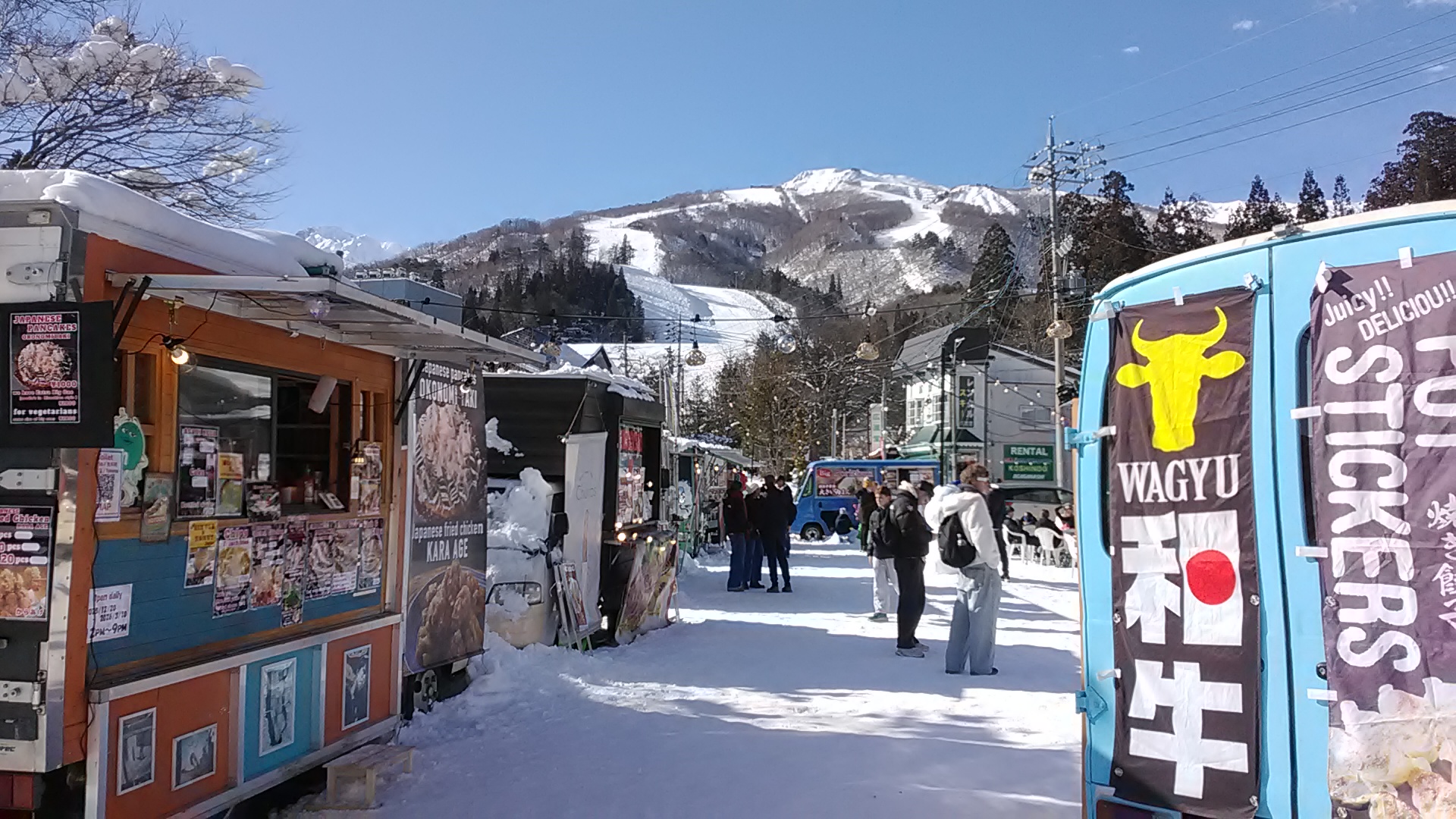 スキー場の近くには今シーズンも屋台村が出現していて、冬のみの屋台村です。客は100%ガイジンでした。