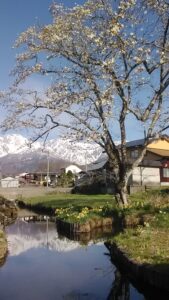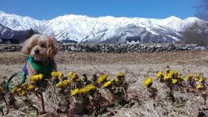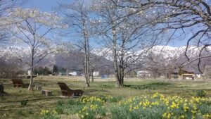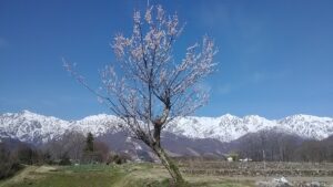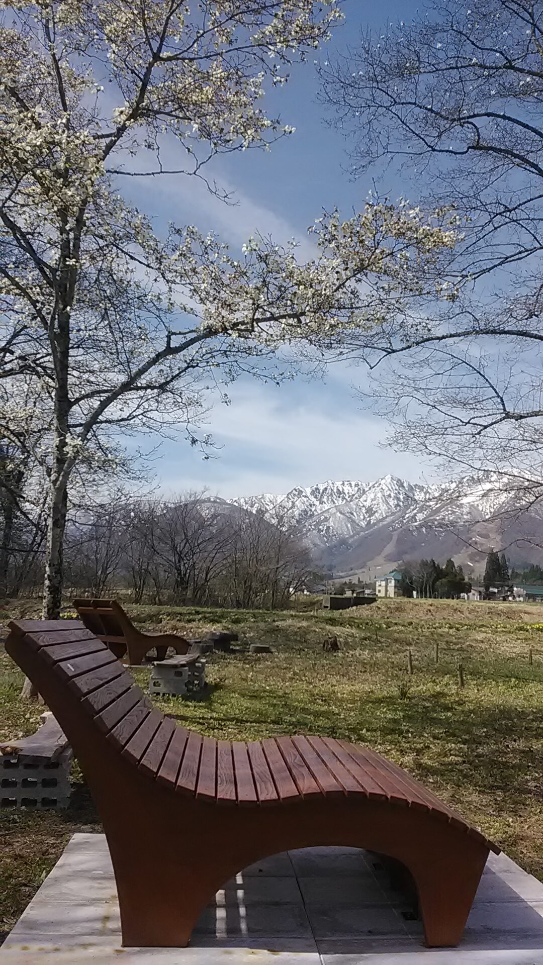 白馬三山を向いているベンチに座ってみたらこんな景色でした。これで平成ノブシコブシが満開になれば気持ちいいでしょうね(写真 5・6・7)。
